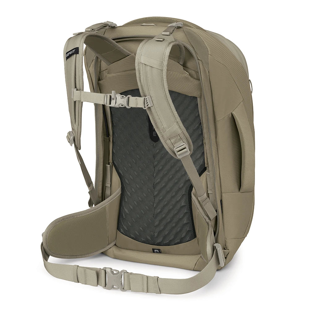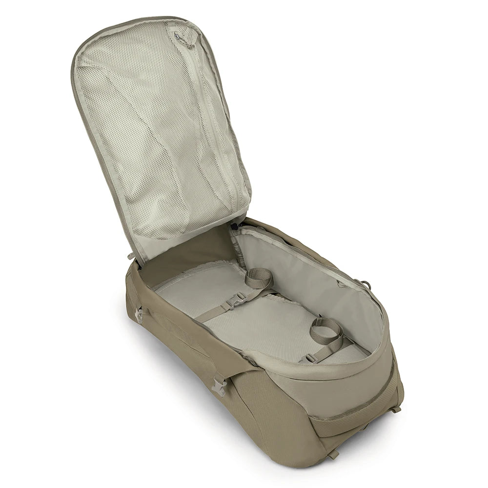 Osprey’s Fairview-lijn is afgestemd op een vrouwenlichaam: schouderbanden en heupgordel sluiten slanker aan en de ruglengte past beter bij kortere torso’s. Het frame en de heupgordel helpen het gewicht van je schouders naar je heupen te verplaatsen, wat vooral merkbaar is als je langere stukken loopt tussen station, hostel en luchthaven. Handig detail: het draagstel kun je wegwerken achter een ritsflap, zodat bandjes niet blijven haken tijdens transport.