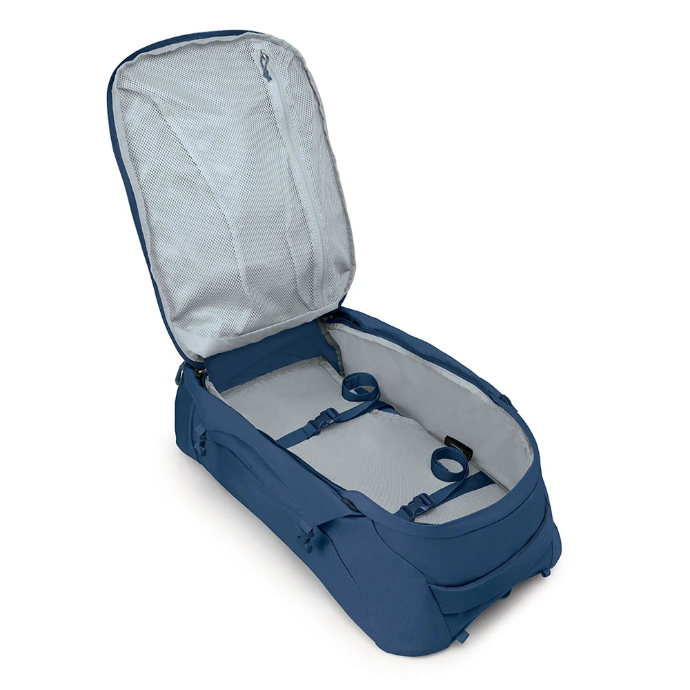 De inhoud is duidelijk verdeeld: de 40 liter hoofdtas is bedoeld voor kleding, schoenen en grotere items en opent met een rits rondom, zodat je als een koffer in- en uitpakt. Interne compressieriemen houden je bagage strak op z’n plek, wat vooral handig is als je vaak verplaatst. De 15 liter daypack klik je los voor dagtrips en gebruik je voor spullen die je snel nodig hebt, zoals water, snacks, camera, powerbank en reisdocumenten. Tijdens transit kun je de daypack ook aan de voorkant dragen: dat geeft extra balans en je hebt je waardevolle spullen dichter bij je.